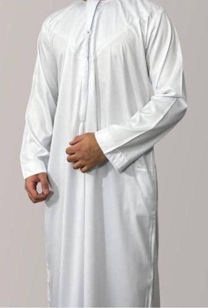 Crafted from luxurious satin-gloss polyester, this thobe embodies serenity, simplicity, and modesty in line with Islamic values. With its pure white hue, this garment is perfect for special occasions, to ensure a dignified and effortlessly refined look.
